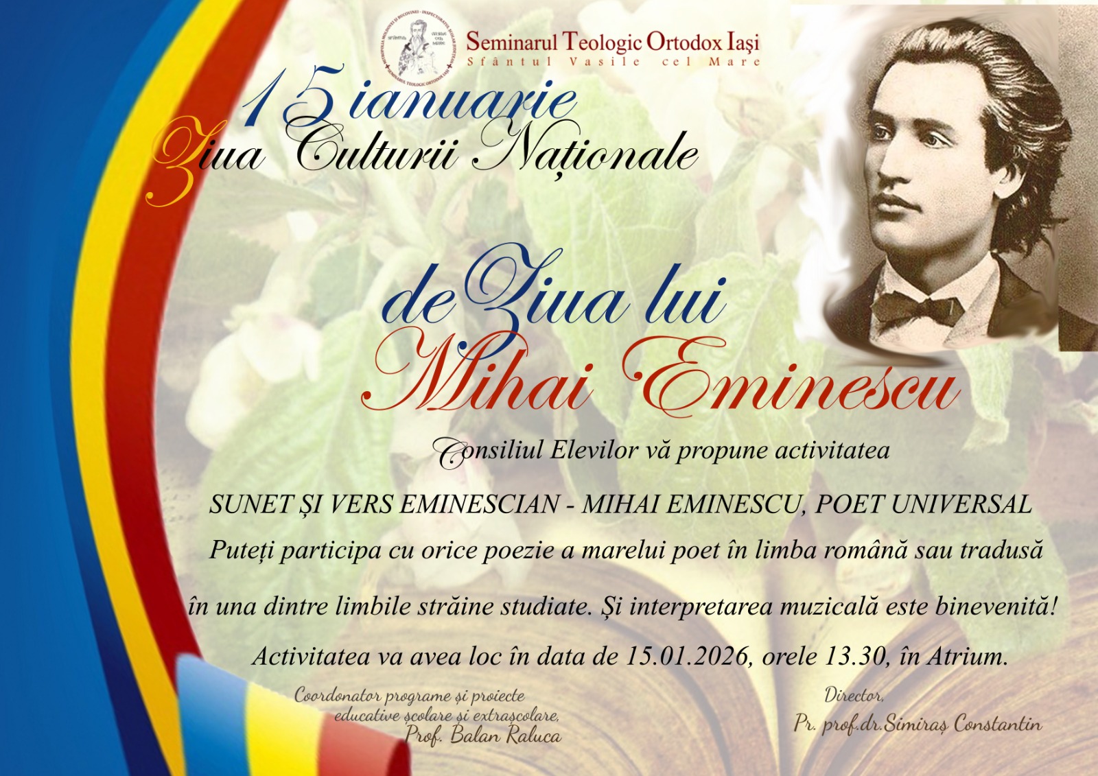 Cu prilejul zilei lui Mihai Eminescu, în data de 15.01.2026, elevii seminariști au celebrat cultura română prin interpretări artistice ale poeziilor eminesciene, aducând în prim-plan sensibilitatea, profunzimea și frumusețea cuvântului românesc. Momentul a fost o invitație la reflecție și recunoștință față de moștenirea literară lăsată de poetul național.