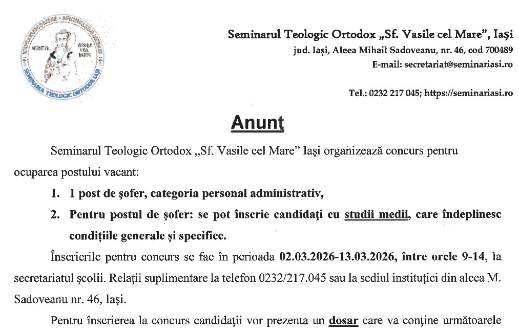 23 Februarie 2026 Postat în: Mobilitatea personalului Concurs pentru ocuparea postului vacant de șofer Documente atasate anunt_post_sofer.pdf (209.47 KB) bibliografie_post_sofer_2026.pdf (240.41 KB) fisa_post_sofer.docx (39.89 KB)