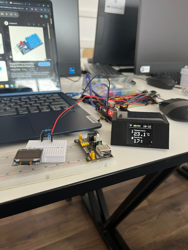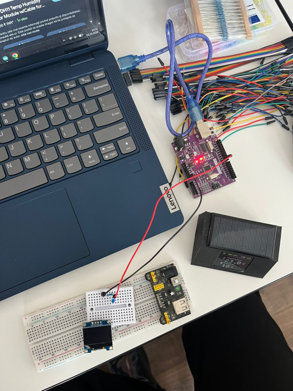 * Creierul Sistemului: Dispozitivul are la bază o placă ESP, programată să colecteze și să proceseze datele primite de la un senzor de temperatură și umiditate. Valorile sunt afișate în timp real pe un ecran integrat, oferind informații clare despre mediul înconjurător.