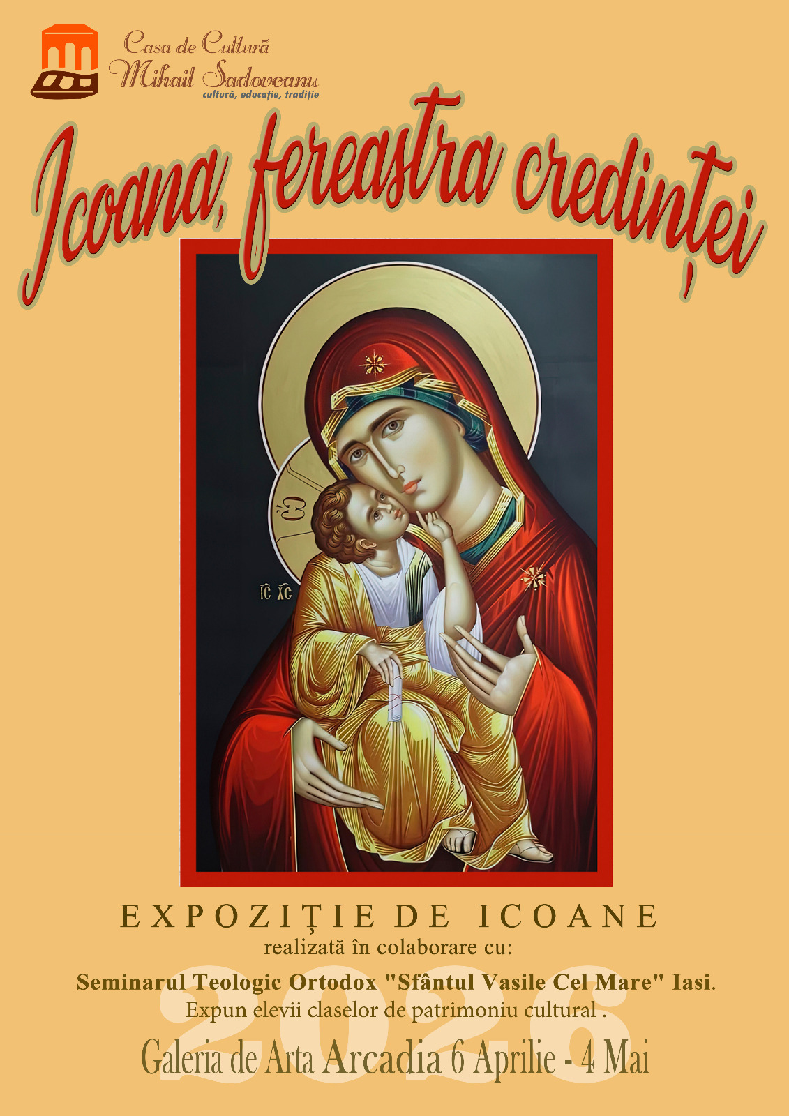 5 Aprilie 2026 Postat în: Expoziții – Artă și icoană În perioada 6 aprilie - 4 mai 2026, Galeria de Artă „Arcadia” găzduiește expoziția „Icoana, fereastra credinței”, în care expun lucrări elevii claselor de Patrimoniu Cultural de la Seminarul Teologic Ortodox ieșean.
