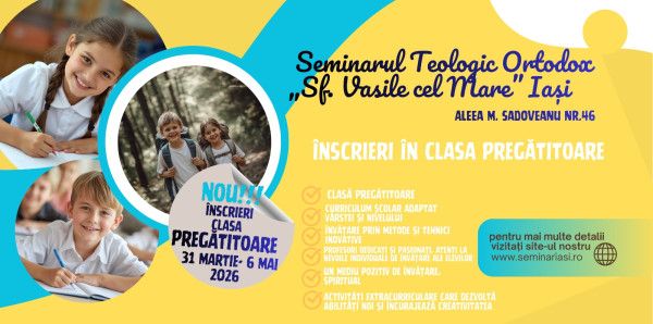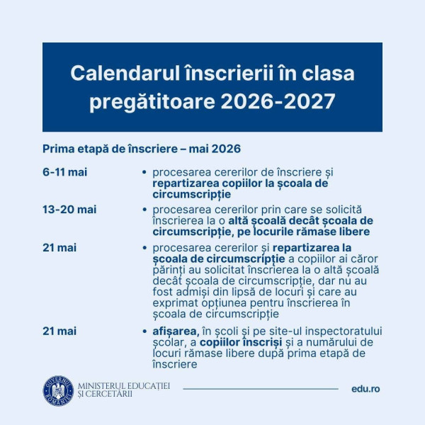 4 Martie 2026 Postat în: Inv. Primar Înscriere în clasa pregătitoare 2026-2027 (sediul din aleea M. Sadoveanu nr. 46)