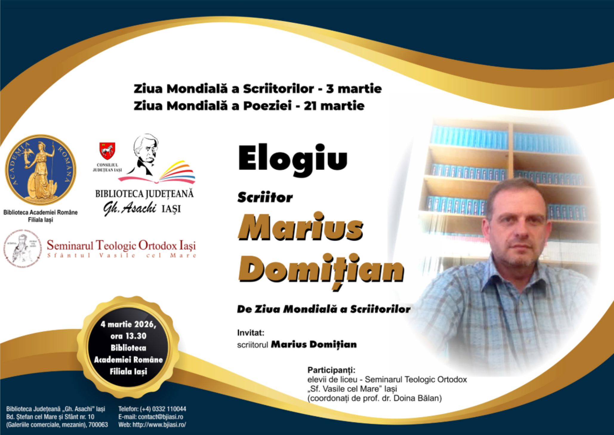 Biblioteca Județeană „Gh. Asachi” Iași în colaborare cu Seminarul Teologic Ortodox „Sf. Vasile cel Mare” Iași va organiza miercuri, 4 martie 2026, evenimentul: Întâlnire cu un scriitor, Marius Domițian în spațiul de înaltă ținută a educației, Biblioteca Academiei Române, Filiala Iași.