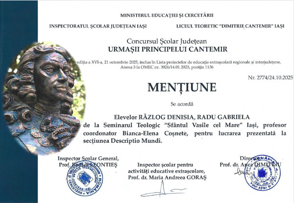 Elevele Denisia Răzlog și Gabriela Radu, din clasa a XI-a D, au fost distinse cu Mențiune la Concursul Școlar Județean „Urmașii Principelui Cantemir”.