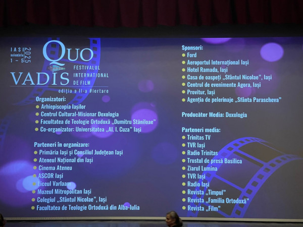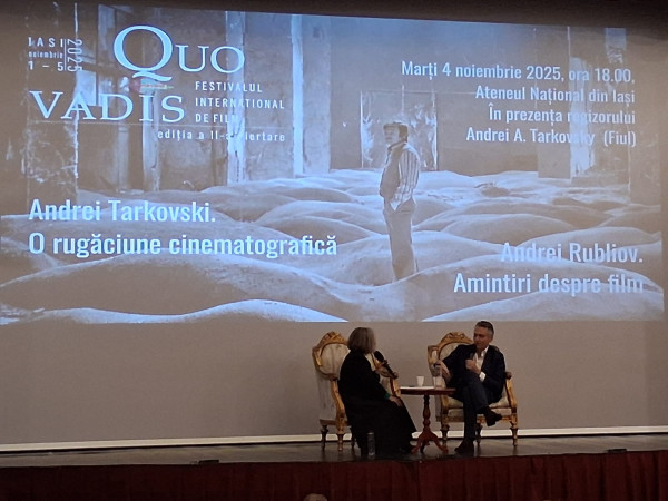 Festivalul Internațional de Film Quo Vadis, ediția a II-a, #iertare, organizat de Arhiepiscopia Iașilor, ne-a prilejuit întâlnirea cu filmele lui Andrei Tarkovski, într-un cadru inedit, la Ateneul Național din Iași. Ne-am bucurat de prezența regizorului Andrei A. Tarkovsky – fiul, care a participat la proiecția filmelor „Andrei Tarkovski. O rugăciune cinematografică” și „Andrei Rubliov. Amintiri despre film” și la un live talk cu Elena Dulgheru – critic de film, jurnalist, traducător, conferențiar la Facultatea de Teologie Ortodoxă din Alba Iulia, precum și a Înaltpreasfințitului Teofan, Mitropolit al Moldovei și Bucovinei.