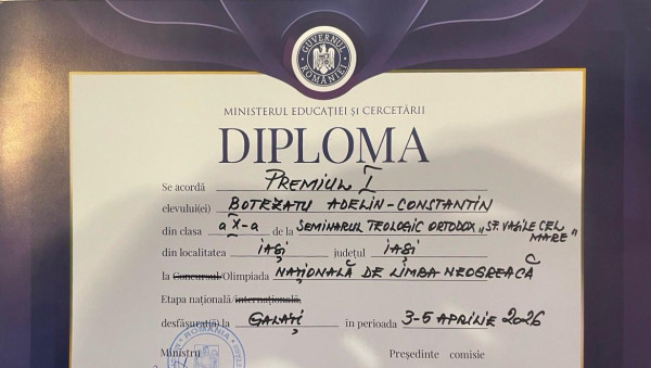 Elevul Adelin - Constantin Botezatu a obținut premiul I la Olimpiada Națională de Limba Neogreacă, desfășurată la Galați în perioada 3-5 aprilie 2026. Felicitări elevului și profesorului coordonator, doamna prof. dr. Mirela Averikios, și mult succes la etapa internațională!