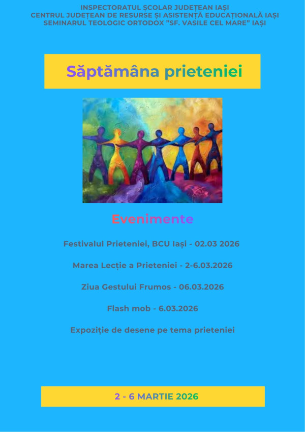 În perioada 2 - 6 martie 2026, la nivelul unității noastre școlare s-au desfășurat activități diverse în cadrul Proiectului Județean „Festivalul Prieteniei”, ediția a XVIII-a 2026, cuprins în Calendarul Proiectelor Educative Extrașcolare Județene al ISJ Iași, coordonat de CJRAE Iași, cu scopul de a promova un climat școlar bazat pe respect reciproc, toleranță, prietenie, empatie, colaborare și altruism.