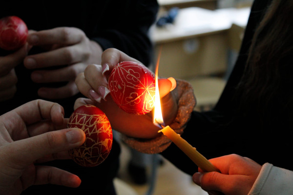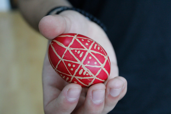 *Scrierea cu ceară: Fiecare linie a fost trasată cu ceară topită, protejând astfel albul oului.