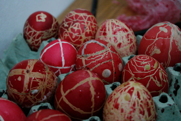 *Botezul culorii: Ouăle au fost imersate în vopsea roșie, culoarea simbol a jertfei și a Învierii.