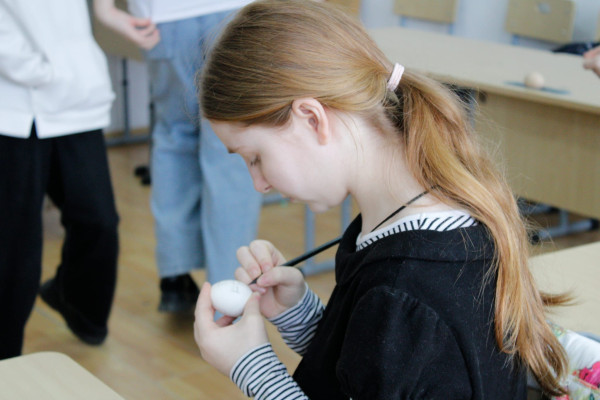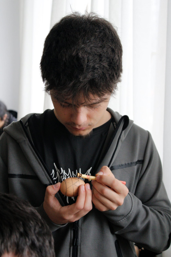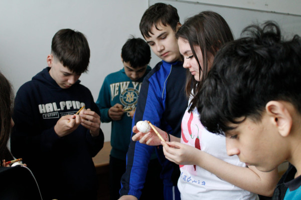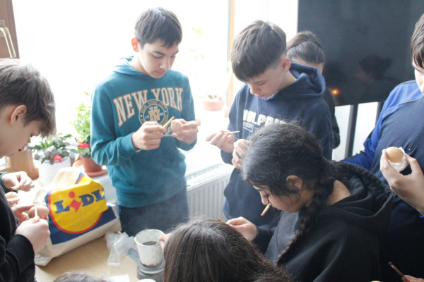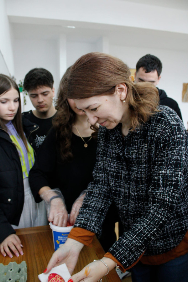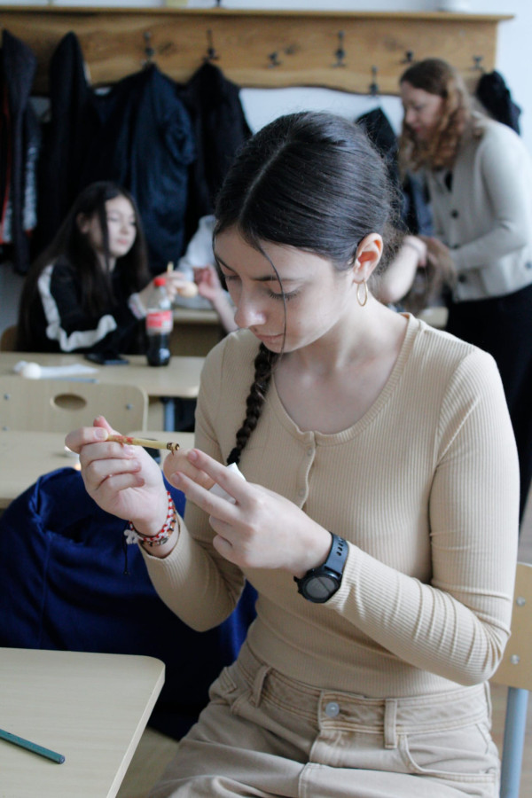 Ajutați de elevele Sofia Botan, Mihaela Ichim, Teodora Gădiceanu și Teodor Nunu, participanții au învățat pas cu pas tehnica tradițională a încondeierii:
