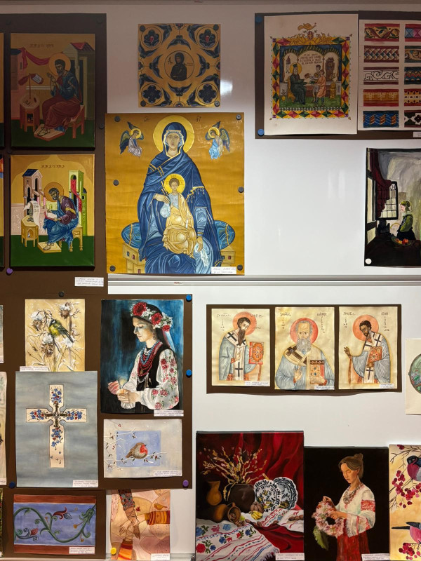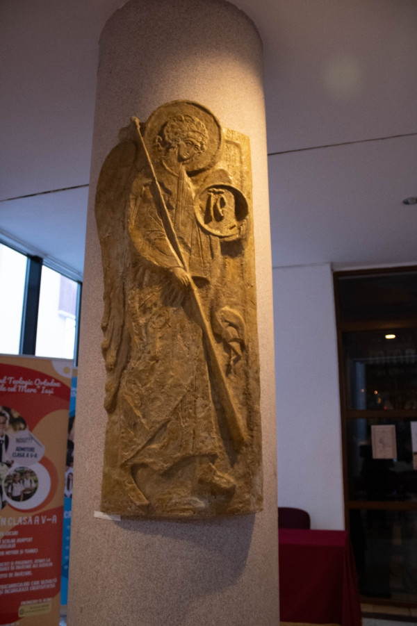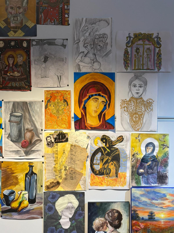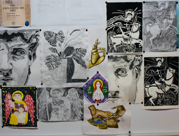 O secțiune fundamentală este rezervată artei sacre, unde compoziții de anvergură precum Nașterea Domnului, chipuri de ierarhi sau hagiografiile sfinților Evangheliști atestă asimilarea profundă a canonului iconografic bizantin. Elevii demonstrează o competență remarcabilă în aplicarea perspectivei inverse, a ierarhiei compoziționale și a frontalității personajelor, respectând cu fidelitate simbolistica cromatică și precizia lineară a prototipurilor tradiționale. Dimensiunea spirituală este susținută și de reliefurile și basoreliefurile cu caracter arhaic. Modelajul și textura evocă materialitatea pietrei sculptate a vechilor mănăstiri, iar accentul pe volum și ritm conferă pieselor un caracter monumental.